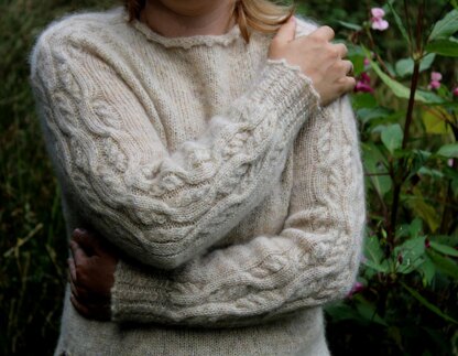 The “Intertwined Roots” Sweater is knitted in the round from the top down and constructed using raglan increases. It features a detailed repetitive cabled motif on top of the sleeves and calming stockinette for the body. The sleeves are worked straight and create a slight bell sleeve before the fitted cuff. The body has a side split at the hip with the back panel longer than the front one. All “ribbing” is created with a cable motif and bound off using the picot bind-off.