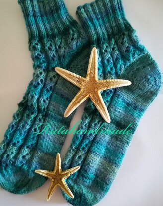 Toe down knitted socks with afterthough heel. Simple lace knit and stockinette. Socks are knitted with circular needles but is possible to knit with set of 5 Dpns. More advanced knitters can knit both socks at time using 80cm circular needles.