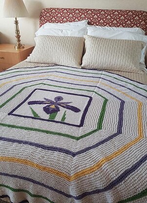 In the summer of 2016, my husband and I took our children on a long-awaited trip to Nova Scotia and Prince Edward Island. We’ve always wanted to visit Atlantic Canada, and my husband has a lot of family there. In Halifax, we were able to stay with his lovely uncle and aunt, who opened their home to us and were marvellous hosts. His aunt particularly likes purple irises, and had decorated her kitchen and dining room with them. As a thank you for their generosity, I designed and made this throw for them.