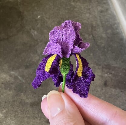 A realistic version of an iris flower, made in Tunisian crochet. While the pattern is for one-size only, using larger hooks will produce a larger flower. The smallest hook (0.4mm) produces a flower (including full flowerhead and stem) of c.4cm (1.75in) wide and 7cm (2.75in) tall. Using a 0.75mm hook gives a flower that is c.6cm (2.25in) wide and 10cm (4in) tall (see photos).