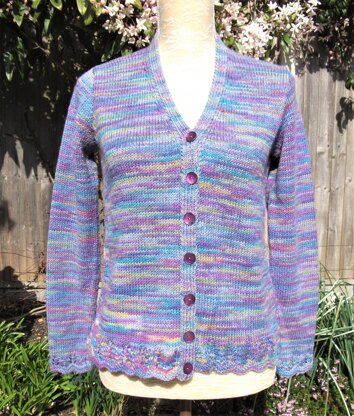 A lovely cardigan, worked mainly in stocking stitch, with narrow lacy borders which form “scallops” at the lower edge.
