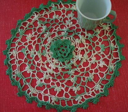 A great gift for the Irish lady in your life, this doily is for the experienced doily maker. The doily features a green rose at the center with little clovers throughout the rounds and along the outer edge.
