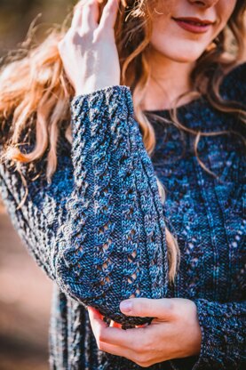 Featuring a combination of waterfall & umbrella lace patterns this standard-fitting, light-weight pullover has gentle shaping between lace panels to allow more room at the hips. With long set-in sleeves, simple Garter trim at the neckline and soft merino yarn, this is designed to be worn next to the skin or over a camisole. It is worked flat from the bottom up, is charted & written out with schematics.