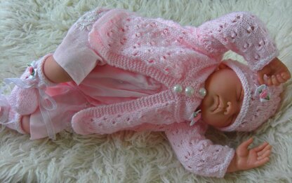 This knitting pattern is to knit a pretty matinee cardigan with matching bootees and hat using DK yarn. This pattern uses Hayfields Baby Bonus DK yarn in 'Baby Pink' and a small amount of white Dk yarn - lthough the set could be knitted in one colour. The whole set is knitted on 4mm needles. This is a pretty little set, ideal for a new baby girl.