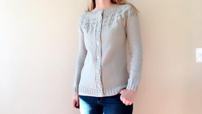 Isla is knit seamlessly from the top-down. The lace pattern is fun yet simple to knit. Garter stitch ridges at the neck, hem, and wrists mirror the ridges incorporated in the lace pattern. The straightforward construction paired with the lace yoke make for a relaxing and interesting knit. The result is a classic, feminine sweater that will be a joy to wear.