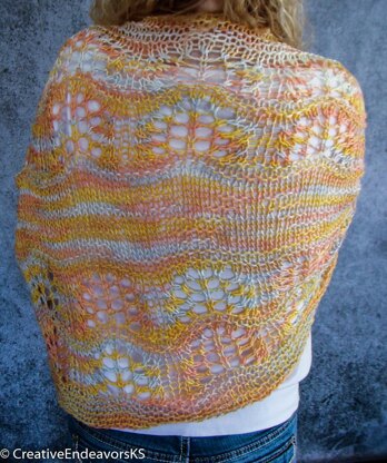 This is a rectangular shawl knit lengthwise from bottom up. The pattern is comprised of two stitch patterns; the Ocean Waves stitch pattern with waves over a background of Stockinette stitch and the Foaming Waves stitch pattern with a blend of Garter Stitch and lace. It is knit with a heavy worsted weight Merino and Silk yarn that has a lovely drape. This is a quick knit that is perfect for playing with both texture and lace.