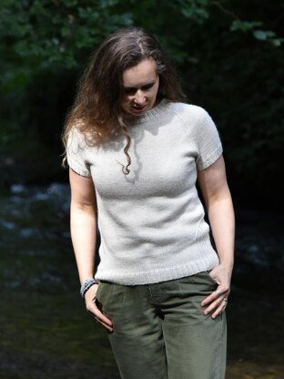 This comfortable short sleeve sweater is knitted bottom up on straight needles. The design features are raglan sleeves, round neck and fancy side panels, which form interesting silhouette of the top. Front, back and sleeves of sweater are knitted separately. After the raglan seams are closed, the stitches are picked up for the collar, which is knitted in the round on circular needle. The length of sweater can be easily adjusted by reducing the length in between fancy side panels and armhole shaping.