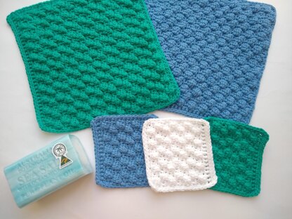Both the scrubbie and washcloth use a mini bobble stitch to create added texture. It is a simple, two row repeated pattern.