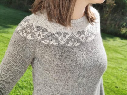 YarnThis sweater is knit with a yarn of type fingering weight (Flora of Drops col : CP medium gray, CC light gray).