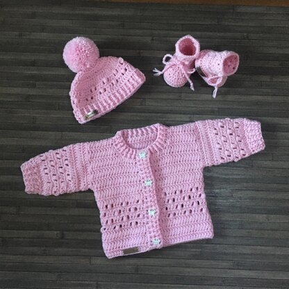IZZY CARDIGAN HAT & BOOTIES SET CROCHET PATTERN PDF - A pretty baby sweater in 3 sizes from Newborn to 2 Years. A hat in 5 sizes Newborn to 10 Years and Booties to 1 Year. Cardigan made seamless bottom up so no sewing of side seams. Hat made in the round top down and booties bottom up. Unisex/Gender Neutral - Baby Boy or Baby Girl.