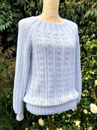 This very flattering, easy fit sweater consists of slightly blouson straight sleeves in a simple eyelet pattern with grippy ribbed cuffs. The body too has an easy pattern with little blocks of eyelets divided by single ribs. The wide ribbed yoke is worked in 2 sections - no circular needles required - and is worked in one with the main parts. The neckline is slightly scooped but if you prefer a closer fit, you could always work another 4-5 rows of rib on a 3 mm needle. The sweater is worked in this lovely cotton mix yarn with a slightly glitzy thread running through it.