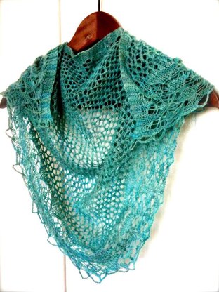 I designed this shawl for my boss’ wedding. She is a very important person in my life and I wanted to make something truly special for her. I decided to take the plunge and design my first shawl. The full square version is designed in top down raglan style using DK weight yarn and larger needles, which provides drape to the mesh body. The lace border and yarn add interest and character to the piece. It will stretch a great deal with blocking, which should be accounted for when deciding on the final length. Instructions and schematics are given to work shawlette or triangular, trapezoidal, or full-square shawl version. Pattern also includes chart for body and border.