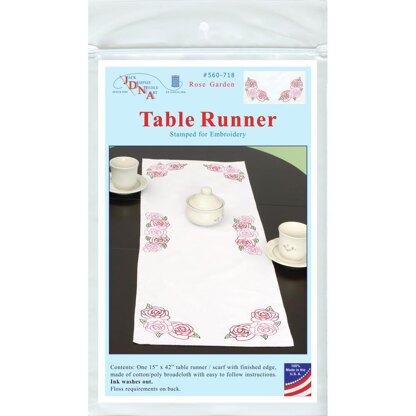 Create a beautiful table runner using this great kit. The stitching designs have been stamped using ink that washes away with any liquid and the fabric is a cotton/poly blend broadcloth. This package contains one 15" x 42" tablecloth with finished edges, instructions for completion and care and a complete list of DMC floss requirements. Hoop, needle and floss sold separately. Design: Rose Garden. Made in USA.