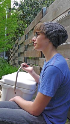 With the author’s permission, I’ve created a hat for Jacob, his teenage brethren, and really anyone who likes a tweedy, cabled cap. The cable runs up just one side of the hat, making the knitting simple and quick, and the sizing very adjustable. Each part of the hat reflects some aspect of Jacob’s character: the neutral color taps into his desire to blend in; the O-shaped cable at the center puns on Jacob’s preferred blood type; and the diminishing cable at the crown hints at the diminishing supplies t