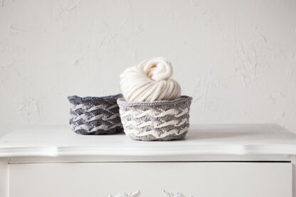 Knit Picks’Dishie yarn held double-stranded creates an extremely durable and stable, yet collapsible, basket. The seed stitch base provides a flat foundation for the basket; stitches are picked up from the base, and the jacquard pattern gently lofts upward to a slightly scalloped I-cord bound off top rim.