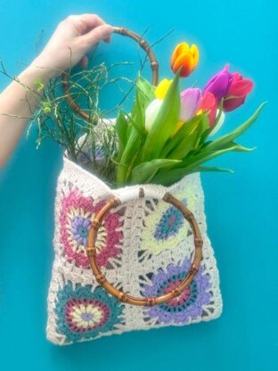 Start by making all motifs, using your favourite colours. Next join all motifs and put bag together. Finishing the upper side and attach both bamboo handles.