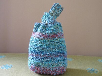 This is a quick and easy bag to make. It's perfect for your small, take-along projects. The bag is 7 inches (17.8cm) high, and the square bottom is 5 inches x 5 inches (12.7cm square). To close the bag, simply push the longer strap through the loop made by the shorter strap. It can, then, be worn on your wrist. Gauge is not really important; however, you will see that I used a smaller hook size in order to create a dense fabric for the bag.