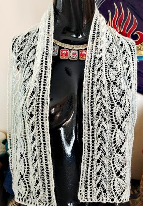 This design features a central lace pattern that is Japanese in origin, surrounded by openwork lace borders and edging. It is knit with a soft blend of Shetland wool and lambswool in a cobweb lace weight yarn.