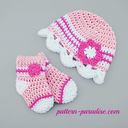 This pretty hat and sock set is perfect for a newborn gift. I like 3 colors for the contrast but of course you can use as many colors as you like.