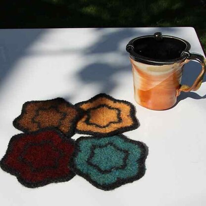 Java Flowers are knit in the round, then felted to create a thick, water resistant coaster. The pattern has instructions for both fingering weight and worsted weight yarns. This is a quick knit with gratifying color possibilities! ~ A fabulous way to use up those bits and pieces of feltable wool.