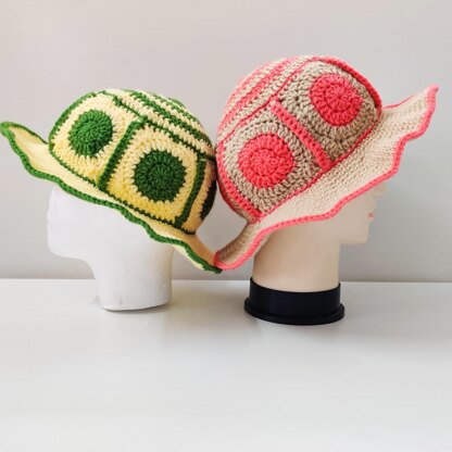 This cute hat is easy and works up fast. We will use solid granny squares to make it. We will join with single crochets, no sewing needed. It has a large polka dot look.