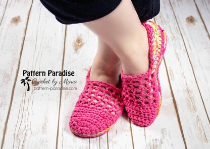 These slippers were inspired by “jelly” sandals my kids had when they were little. They were the perfect sandal to walk in and out of water and they were so bright and had a mesh design for air circulation. I made these with two strands of worsted weight cotton yarn held together throughout. Like the other slippers in this series, they sport a double sole and close fitting foot and ankle for comfort and maximum fit. I sized them for men and women and therefore the sizing is based on foot length. These have become my favorite slippers!