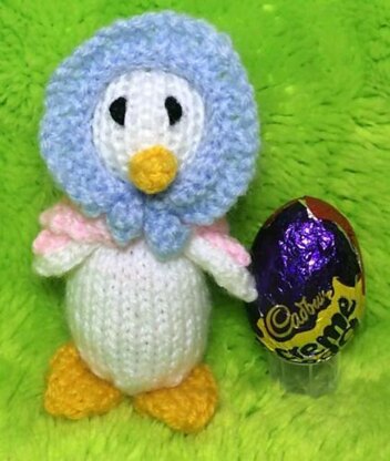 This cute Jemima Puddleduck inspired knitting pattern is for a chocolate cover. I have put a Creme Egg chocolate inside but any similar sweet could be used. This makes a stunning addition to your Easter table, a fantastic fund raising item for fayres and bazaar's or great as a novelty decoration or egg hunt.