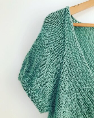 Jenne Sweater is worked in stockinette stitch from the top down it has a deep open back and short sleeves