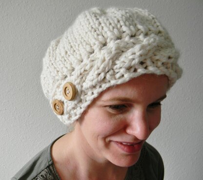 Knitting with super bulky yarn is fast. It also can get boring fast, as it rarely lends itself to more exciting stitch patterns. Here is a break from usual garter and stockinette. This design, while remaining simple even for beginners, introduces a cabled brim with a buttonhole and seven pointed star of decreases on the crown. This sweet and sassy beret will keep you toasty in cold weather. Lusciously soft super bulky yarn and thick needles will help you make this hat in 1-2 hours flat.