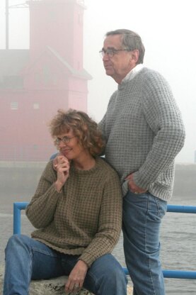 A comfy, casual, raglan crew for women and men with an easy, all-over, checked texture. Based on our popular Jersey Shore children's sweater. Loose fitting, to work in a DK wt yarn. In ten sizes: Hers: XS(30), S(34), M(38), L(42) and XL(46) (with 5 1/2" ease) His: XS(36), S(40), M(44), L(48) and XL(52) (with 4 1/2" ease)