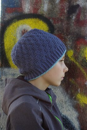 Jey is textured hat, with a contrasting color at the edge of the brim. Terrific texture pattern, that keeps your interest and evolves fast, with an easy to follow rhythm. Finished hat is warm and stretchy, to fit many different head sizes. It looks awesome on both women and men and gives you warmth, cozy and versatile to use.