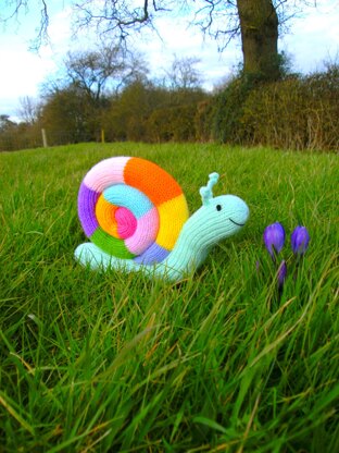 Jimmy Snail is approximately 18cm/7in tall and 26cm/10¼in from nose to tail. He uses very small amounts of yarn and, better still, you can customise his shell to make him as colourful as you like! All pieces are knitted flat on straight needles.