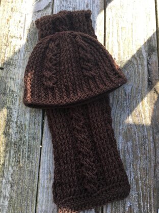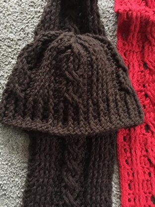 Jim's Twisted Knot has Braids/Cable Stitches that make up the Twisted Knot that runs up the center of the Scarf and all the way around the Beanie.