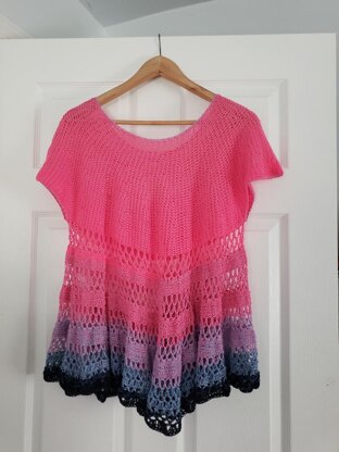 The Joal top is worked top down and in the round. The stitch pattern used on the yoke give the top its knitted look and fitted shape. The mesh pattern used on the body gives the top a flared shape chest down.