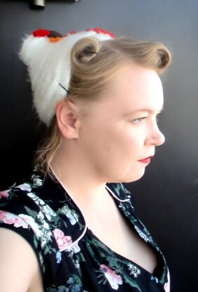 Inspired by the vintage styles of the 1950s, Joan is an unusual and eyecatching funnel hat, worked in bands of reverse stockinette and ruched at the front by picking up stitches from previous rows, keeping it perky. Best worked in a soft fluffy yarn , the hat can be trimmed in a number of ways, or left untrimmed (but certainly not plain!)