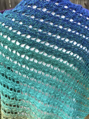 An asymmetric triangle shawl in a beautiful lace stitch. It begins with a short end building with increases on one side within an eight-row repeat. This is an intermediate pattern.