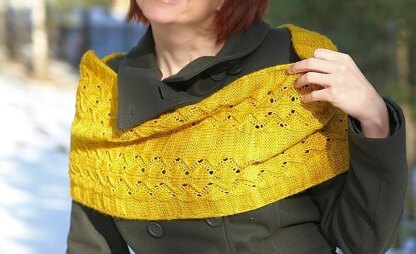 “Jollyoly Cowl” is one stylish accessory that can be worn for warmth and for fashion.Using approximately two skeins of sport weight yarn, the pattern incorporates stockinette stitch and a delicate lace motif to provide a satisfying yet simple knit project.