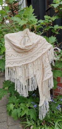 The classic triangle shaped shawl is knitted using 100% vintage white cotton. The simple flowing chevron style lacework and stockinette/gartered stitches panel represent the stunning steep gigantic glacier stand along the beautiful river valley, while the popcorn stitches are the falling snow softly landed on the top of glaciers.