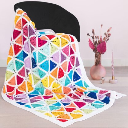 Josephine’s rainbow blanket is an explosion of colour! The cheerful triangles make for a stunning palette to work with. The motifs can be made in advance, or joined as you go. It’s up to you!