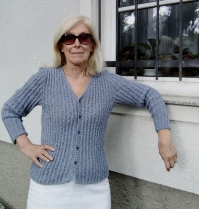 The Josy Cardigan is a nice cabled summer sweater. It is worked flat , bottom up. Around the front and neckline a crocheted edge with buttonholes is made (single crochet and reverse single crochet).