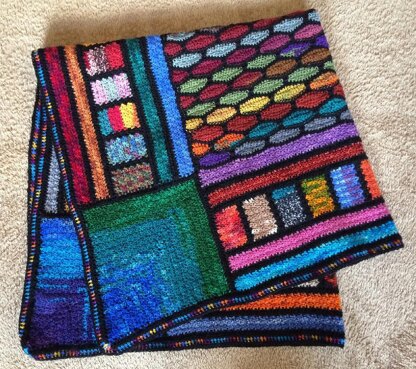 Self-patterning, solid, gradient, and variegated yarn can all be used to good effect, and most sections require just under 5 grams or just under 10 grams, making this a perfect project for the mini-skein addict. Pattern calls for 200 grams of black fingering weight yarn and 400 grams of fingering weight scraps or colors.