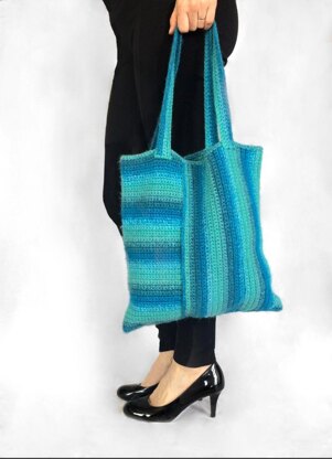 A crochet pattern for a versatile bag that is easy to make. Make a graphic statement as you carry this 13" wide x 14" tall bag (not including handles). Self striping yarn makes this project a quick way to create a pattern without so many ends to weave in. A great project for beginners.