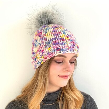 I get a real sense of joy when I look at the yarn for this pompom hat - it’s so colourful! Just right for a miserable Winter's day! Super-chunky/super-bulky yarn means extra warmth in those cold, winter winds. A fluffy pompom tops it off nicely, or you could make your own.