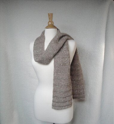 Juli is a lengthwise ribbed scarf in a chunky yarn. A dramatic change takes place when blocked – a short wide piece stretches into a long, drapy scarf!