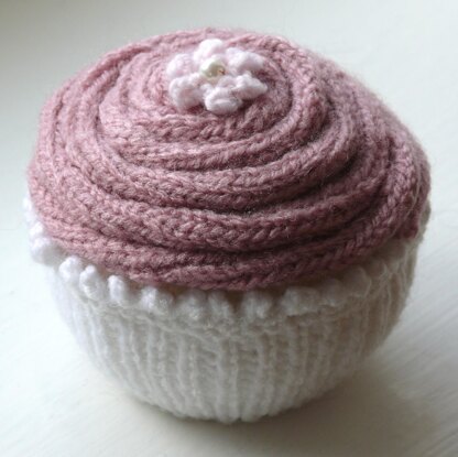 A knitted i-cord is made to resemble a thick swirl of icing, and it's topped with a little flower with beaded centre.