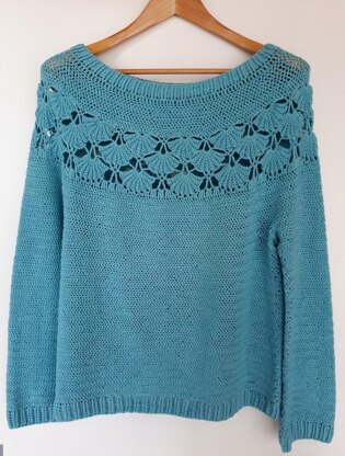 Pattern on crochet top down. Size: 48-50. Difficulty Intermediate Jumper is worked from the neckband down, from 100% mercerized cotton 508 meters in 150 grams (Pinguin, Bella Fashion). Product weight 500 grams. Pattern in pdf format, with a photo, with a description of the crochet process and charts.