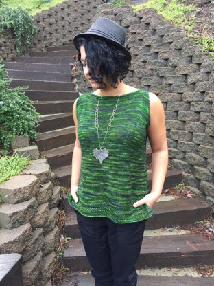 June Lake is going to fast be-come your go to top for Spring. This versatile tunic can be worn over shorts, jeans, pants or skirts. Using just two skeins of fingering weight yarn, it is a fun, quick knit. Perfect for showcasing those special skeins. This body flatter-ing tunic has gradual A-line shaping with a sophisticated boat-neck. The garment is knit from the bottom up, starting with two textured border bands that are joined to work in the round. It is then separated for the armholes where tapered decreases create an elegant silhouette. The neck is finally finished off with an i-cord bind off.