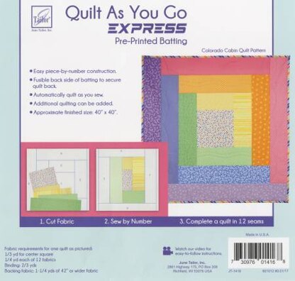 Create the Colorado Cabin quilt pattern with this Quilt As You Go Express Pre-Printed Batting.\n\n• Easy piece-by-number construction.\n• Fusible back side of batting to secure quilt back.\n• Automatically quilt as you sew.\n• Additional quilting can be added.\n\nSteps:\n1. Cut Fabric\n2. Sew by Number\n3. Complete a quilt in 12 seams\n\nFabric Requirements for one quilt as pictured:\n• 1/3 yd for center square\n• 1/4 yd each of 12 fabrics\n• Binding: 2/3 yds\n• Backing fabric: 1-1/4 yds of 42 in or wider fabric