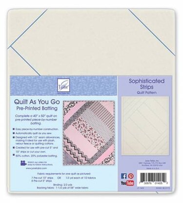 Create this Sophisticated Strips quilt pattern with the Quilt As You Go Pre-Printed Batting. Includes one sheet of pre-printed for a 40" x 50” finished quilt.\n\n• Complete a 40 in x 50 in quilt on pre-printed piece-by-number batting.\n• Easy piece-by-number construction.\n• Automatically quilt as you sew.\n• Designed with 1/2 in seam allowances, making it ideal for use with plush, velour fleece or quilting cottons.\n• Created for use with pre-cut 5 in and 10 in strips or cut your own.\n• 80% cotton, 20% polyester batting\n\nFabric Requirements for one quilt as pictured:\n• 7 Pre-cut 10 in strips\n• 8 Pre-cut 5 in strips\nOR\n• 1/3 yd each of 10 fabrics\n• Binding: 2/3 yds\n• Backing fabric 1-1/4 yds of 58 in wide fabric