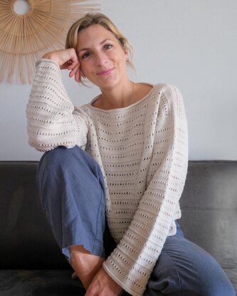 The Juniper Blouse is a boxy summer knit featuring a delicate pintuck edge at the neckline and armholes. Fine eyelet lace alternates with textured knitting in knit and purl stitches, giving the blouse a romantic boho vibe. It hast a positive ease of 10-15cm.